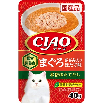| 原材料Ingredients | まぐろ、鶏肉(ささみ)、鶏脂、ほたてエキス、糖類(オリゴ糖等)、植物性油脂、ミネラル類(Ca、Cu、Mn、Zn、I、Fe、Na、P、Cl、K)、増粘安定剤(加工でん粉、増粘多糖類)、調味料(アミノ酸)、ビタミン類(A、E、B₁、B₂、B₆、B₁₂、K、コリン、ビオチン、葉酸)、紅麹色素、タウリン、緑茶エキス |