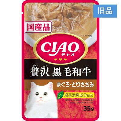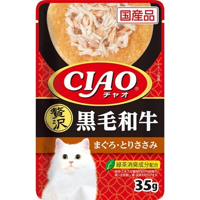 | 原材料Ingredients | 鶏肉(ささみ)、まぐろ、牛肉、ビーフエキス、タンパク加水分解物、糖類(オリゴ糖等)、植物性油脂、増粘安定剤(加工でん粉、増粘多糖類)、ミネラル類(Na、P、Cl)、調味料(アミノ酸)、ビタミンE、トマト色素、緑茶エキス |