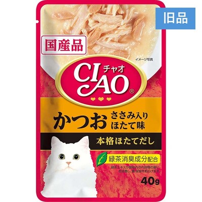 | 原材料Ingredients | 鶏肉(ささみ)、かつお、ほたてエキス、糖類(オリゴ糖等)、植物性油脂、増粘安定剤(加工でん粉、増粘多糖類)、ミネラル類(Na、P、Cl)、調味料(アミノ酸)、ビタミンE、トマト色素、緑茶エキス |