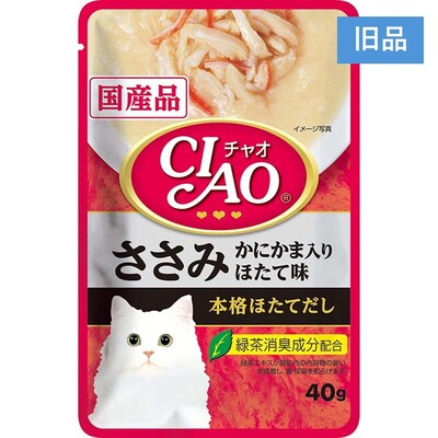 | 原材料Ingredients | 鶏肉(ささみ)、かに風味かまぼこ、ほたてエキス、糖類(オリゴ糖等)、植物性油脂、増粘安定剤(加工でん粉、増粘多糖類)、ミネラル類(Na、P、Cl)、調味料(アミノ酸)、ビタミンE、トマト色素、緑茶エキス |