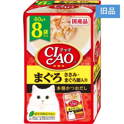 | 原材料Ingredients | 鶏肉(ささみ)、まぐろ、まぐろ節、かつお節エキス、糖類(オリゴ糖等)、植物性油脂、増粘安定剤(加工でん粉、増粘多糖類)、ミネラル類(Na、P、Cl)、調味料(アミノ酸)、ビタミンE、トマト色素、緑茶エキス |