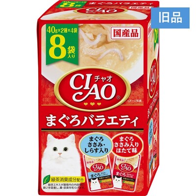 | 原材料Ingredients | 【まぐろ ささみ・しらす入り】鶏肉(ささみ)、まぐろ、しらす、かつお節エキス、糖類(オリゴ糖等)、植物性油脂、増粘安定剤(加工でん粉、増粘多糖類)、ミネラル類(Na、P、Cl)、調味料(アミノ酸)、ビタミンE、トマト色素、緑茶エキス 【まぐろ ささみ入り ほたて味】鶏肉(ささみ)、まぐろ、ほたてエキス、糖類(オリゴ糖等)、植物性油脂、増粘安定剤(加工でん粉、増粘多糖類)、ミネラル類(Na、P、Cl)、調味料(アミノ酸)、ビタミンE、トマト色素、緑茶エキス |