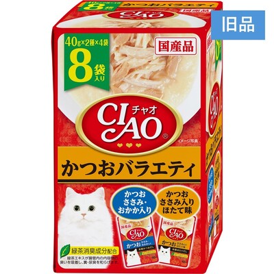 | 原材料Ingredients | 【かつお ささみ・おかか入り】鶏肉(ささみ)、かつお、かつお節、かつお節エキス、糖類(オリゴ糖等)、植物性油脂、増粘安定剤(加工でん粉、増粘多糖類)、ミネラル類(Na、P、Cl)、調味料(アミノ酸)、ビタミンE、トマト色素、緑茶エキス 【かつお ささみ入り ほたて味】鶏肉(ささみ)、かつお、ほたてエキス、糖類(オリゴ糖等)、植物性油脂、増粘安定剤(加工でん粉、増粘多糖類)、ミネラル類(Na、P、Cl)、調味料(アミノ酸)、ビタミンE、トマト色素、緑茶エキス |